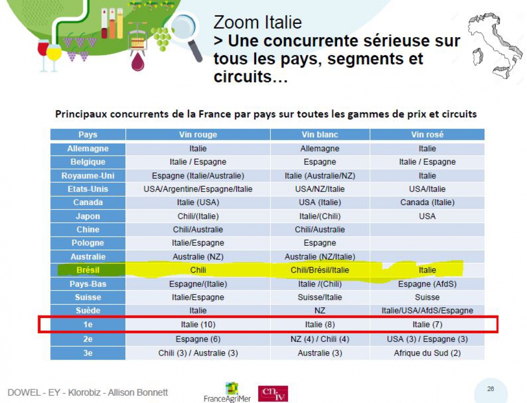 Já a segunda parte foi dedicada a análise transversal da percepção do vinho francês sobre seus mercados alvo (pelos operadores), evolução dos mercados, questões e oportunidades. Dentre os 13 países analisados – China, Brasil, Japão, Polônia, EUA, Canadá, Reino Unido, Holanda Bélgica Suécia, Alemanha, Austrália e Suíça, o Brasil responde por modestos 0,4% das exportações francesas, o menor mercado do grupo analisado. Apesar de não sermos um grande mercado para o vinho francês o Brasil oferece um potencial de crescimento importante, afinal é um grande país de cultura ocidental. O estudo foi realizado por Dowel, EY, Klorobiz e a consultoria Allison Bonnet. O estudo mostra a composição da oferta e seu posicionamento por faixa de preços e segmentos.