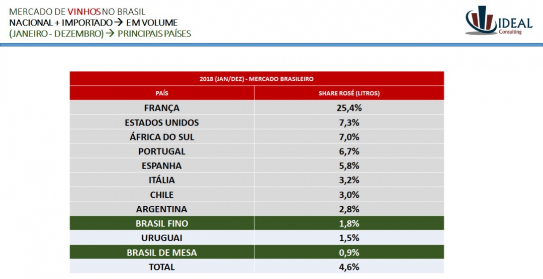 Outro ponto que me causou perplexidade foi quando citam os principais concorrentes dos vinhos franceses por cor. Tintos apontam para os chilenos. Concordo. Eles lideram com folga o segmento. Brancos citam Chile (15,7% dos vinhos chilenos exportados são brancos, como eles lideram 46% do volume a informação é justa), Brasil e Itália (exporta 41% menos do que Portugal), informação errada. Mas o que me choca são os concorrentes dos vinhos rosés, único mercado onde a França lidera, aqui eles citam exclusivamente a Itália. Me parece um erro grosseiro. Em 2018 segundo a Ideal, a França exportou 25,4% do volume de rosados, os EUA 7,3%, foi a moda do Zinfandel, seguido pela África do Sul, 7%, Portugal com seu popular Mateus Rosé atingiu 6,7% e Espanha com 5,8% é a quinta colocada. A Itália se contenta com um modesto sexto lugar e 3,2% de participação. Bem longe dos demais concorrentes.